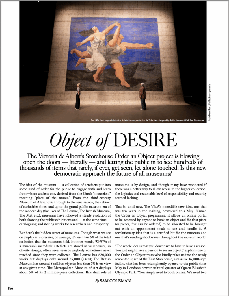 The Victoria & Albert’s Storehouse Order an Object project is blowing open the doors—literally—and letting the public in to see hundreds of thousands of items that rarely if ever get seen let alone touched. Is this new democratic approach the future of all museums? This latest published piece in L’Officiel takes you inside the new storehouse for exclusive access.